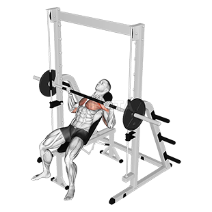 通常のベンチプレスのようにラックを使ってやってもいいのですが、個人的に、スミスマシンを使ってやるのがおすすめ。