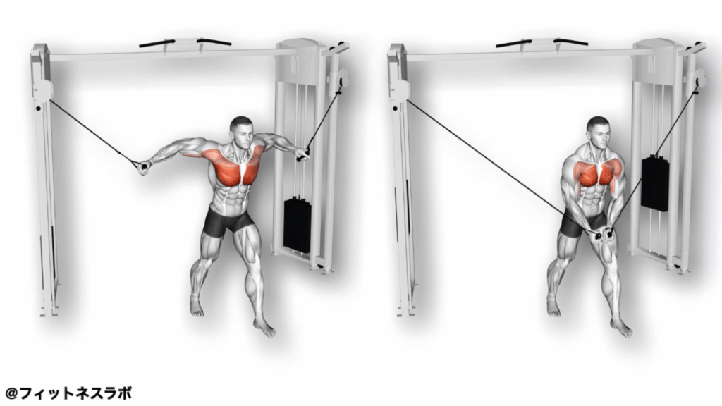 この種目はケーブルを2つ使って大胸筋の下を刺激してあげる種目です。